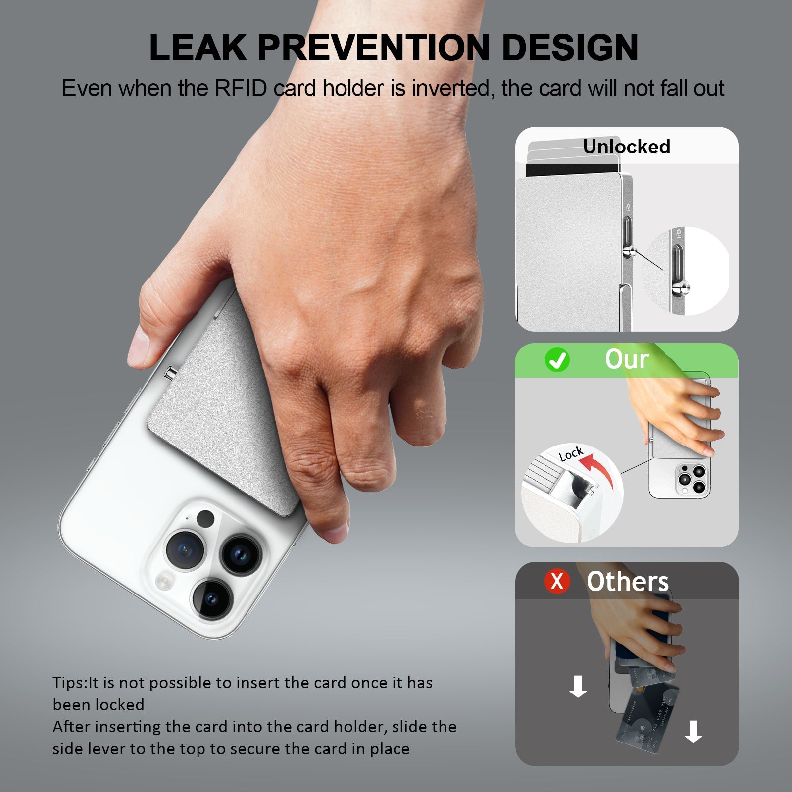 Prevent Theft, Leak Prevention : The card holder exit right side adopts a unique design,please push the metal switch to the top to lock cards to prevent your cards from falling out. No matter how you hold your phone, the cards will stay in the metal case safely. |